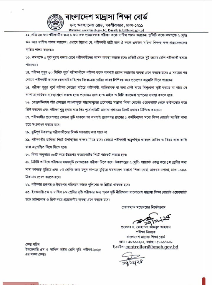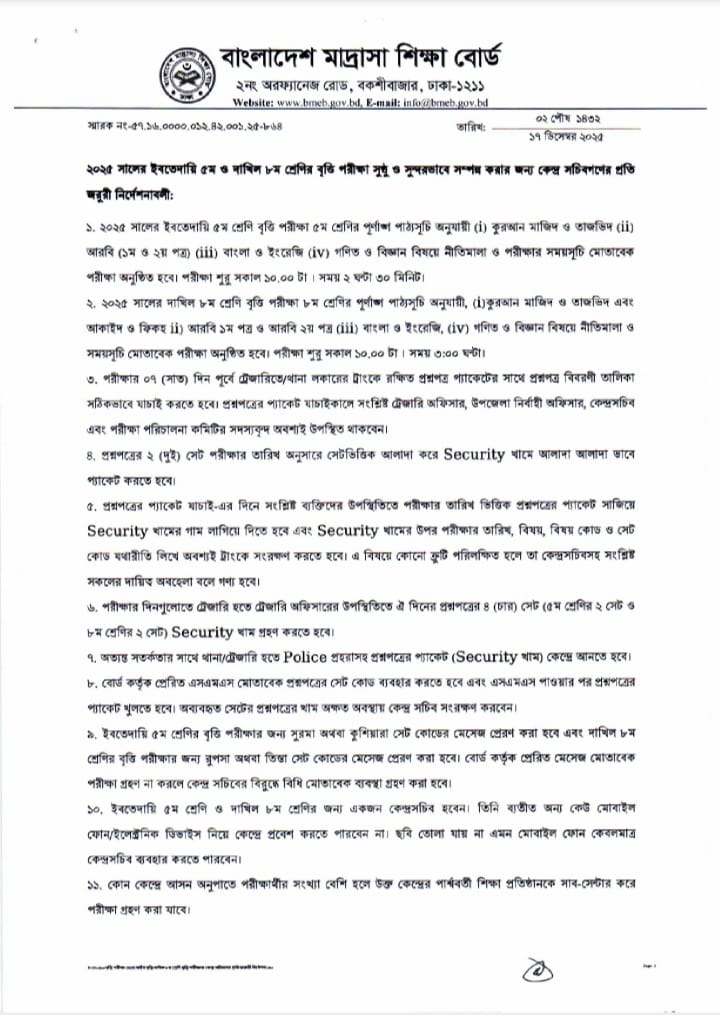 চলতি বছরের ৫ম শ্রেণির ইবতেদায়ি ও ৮ম শ্রেণির দাখিল বৃত্তি পরীক্ষা সুষ্ঠু ও সুন্দরভাবে সম্পন্ন করার জন্য কেন্দ্র সচিবদের প্রতি ২৩ জরুরি নির্দেশনা দিয়েছে মাদ্রাসা শিক্ষা বোর্ড। বুধবার (১৭ ডিসেম্বর) বোর্ডের পরীক্ষা নিয়ন্ত্রক প্রফেসর ড. মোহাম্মদ কামরুল আহসান স্বাক্ষরিত এক বিজ্ঞপ্তিতে এ তথ্য জানানো হয়েছে।