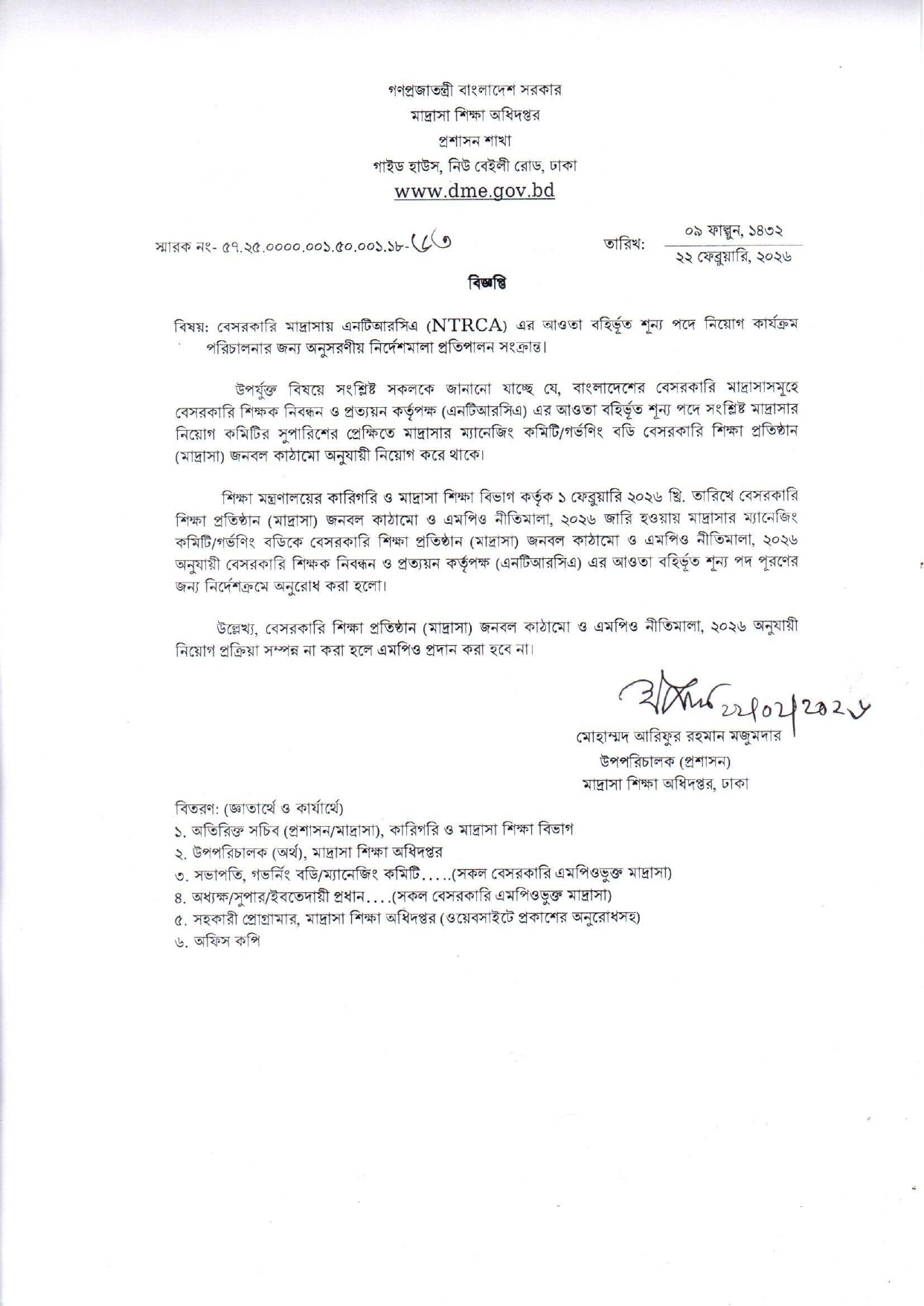 এতে আরও বলা হয়, গত ১ ফেব্রুয়ারি শিক্ষা মন্ত্রণালয়ের কারিগরি ও মাদ্রাসা শিক্ষা বিভাগের বেসরকারি শিক্ষা প্রতিষ্ঠান (মাদ্রাসা) জনবল কাঠামো ও এমপিও নীতিমালা, ২০২৬ জারি হওয়ায় মাদ্রাসার ম্যানেজিং কমিটি ও গভর্নিং বডিকে এ নীতিমালা অনুযায়ী বেসরকারি শিক্ষক নিবন্ধন ও প্রত্যয়ন কর্তৃপক্ষ (এনটিআরসিএ) এর আওতাবহির্ভূত শূন্যপদ পূরণের জন্য নির্দেশ করা হলো।