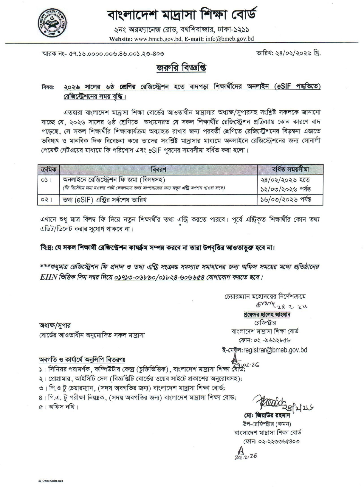 বিজ্ঞপ্তিতে বলা হয়, ২০২৬ সালের ৬ষ্ঠ শ্রেণিতে অধ্যয়নরত যে সব শিক্ষার্থীরা রেজিস্ট্রেশন প্রক্রিয়ায় কোনো কারণে বাদ পড়েছে, সে সকল শিক্ষার্থীর শিক্ষাকার্যক্রম অব্যাহত রাখার জন্য পরবর্তী শ্রেণিতে রেজিস্ট্রেশনের বিড়ম্বনা এড়াতে ভবিষ্যৎ ও মানবিক দিক বিবেচনা করে তাদের সংশ্লিষ্ট মাদ্রাসার মাধ্যমে অনলাইনে রেজিস্ট্রেশনের জন্য সোনালী পেমেন্ট গেটওয়ের মাধ্যমে ফি পরিশোধ এবং eSIF পূরণের সময়সীমা বর্ধিত করা হলো।