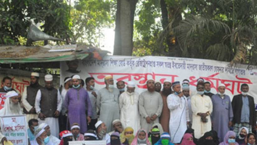 সমিতির সভাপতি মাওলানা হাফেজ কাজী ফয়েজুর রহমানের সভাপতিত্বে অবস্থান ধর্মঘটে বক্তব্য দেন মহাসচিব কাজী মোখলেসুর রহমান, ওলামা লীগের সিনিয়র সহ-সভাপতি মো. শাহজাহান, এ বি এম আব্দুল কুদ্দুস প্রমুখ।