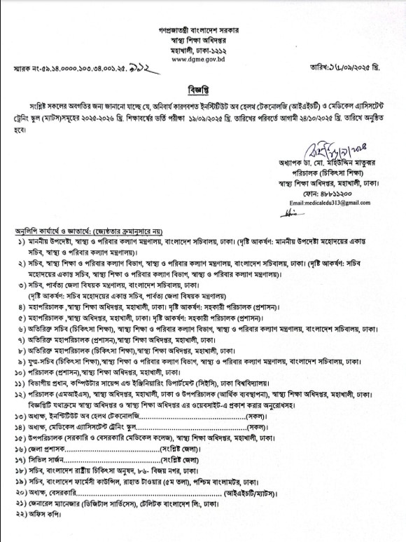 বিজ্ঞপ্তিতে বলা হয়েছে, অনিবার্য কারণবশত ইনস্টিটিউট অব হেলথ টেকনোলজি (আইএইচটি) ও মেডিকেল এ্যাসিসটেন্ট ট্রেনিং স্কুল (ম্যাটস) সমূহের ২০২৫-২৬ শিক্ষাবর্ষের ভর্তি পরীক্ষা ১৯ সেপ্টেম্বরের পরিবর্তে আগামী ২৪ অক্টোবর অনুষ্ঠিত হবে।