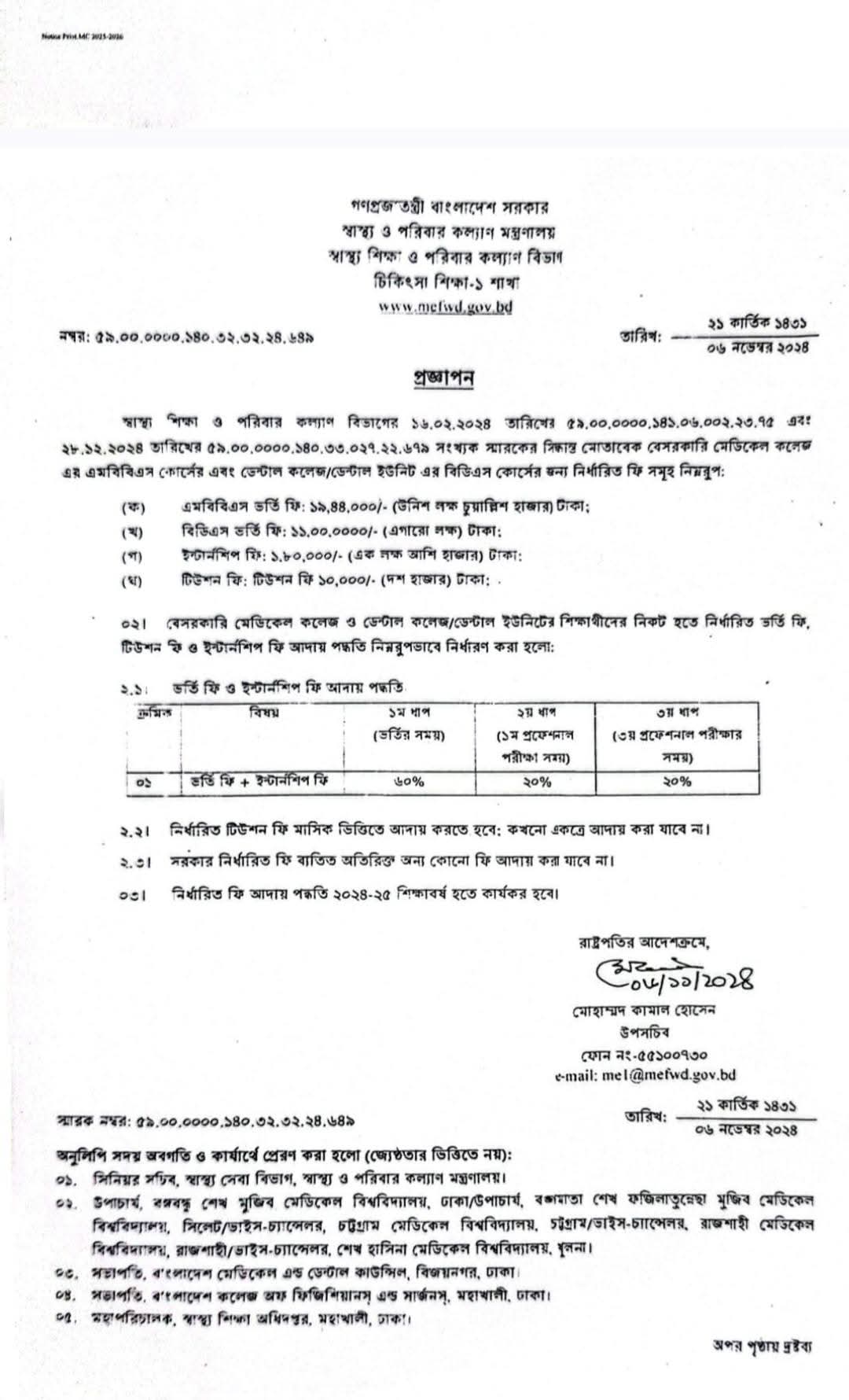 ২০২৫-২০২৬ শিক্ষাবর্ষে বেসরকারি মেডিকেল ও ডেন্টাল কলেজে ভর্তিচ্ছু শিক্ষার্থীদের আগামী ২৩ এপ্রিলের মধ্যে ভর্তি ও টিউশন ফির প্রথম কিস্তি—মোট নির্ধারিত ফির ৬০ শতাংশ—পরিশোধের নির্দেশ দিয়েছে স্বাস্থ্য শিক্ষা অধিদপ্তর। রবিবার (১৯ এপ্রিল) স্বাস্থ্য শিক্ষা অধিদপ্তর থেকে দেওয়া এক বিজ্ঞপ্তিতে এ তথ্য জানানো হয়।