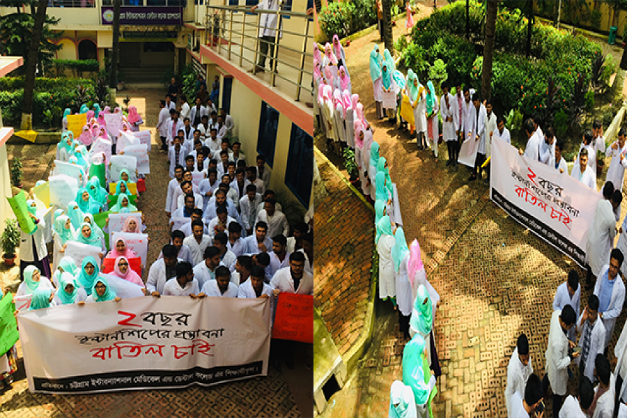সোমবার স্বাস্থ্য ও পরিবার কল্যাণ মন্ত্রণালয় প্রস্তাবিত ‘মেডিকেল শিক্ষার্থীদের দুই বছর ইন্টার্নশীপ’র খসড়া বাতিলের দাবিতে দেশব্যাপী চলমান কার্যক্রমের অংশ হিসেবে চট্টগ্রাম ইন্টারন্যাশনাল মেডিকেল কলেজ এবং চট্টগ্রাম ইন্টারন্যাশনাল ডেন্টাল কলেজ এর শিক্ষার্থীদের সম্মিলিত উদ্যোগে নানা কর্মসূচি পালিত হয়েছে।