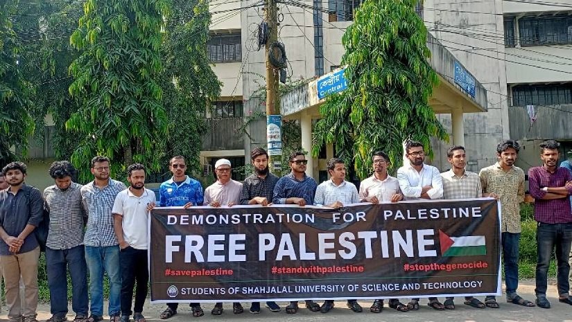 ফিলিস্তিনিদের ওপর ইসরাইলের চলমান আগ্রাসনের বিরুদ্ধে দেশটির স্বাধীনতাকামী হামাসের প্রতিরোধ আন্দোলনের সাথে সংহতি জানিয়ে মানববন্ধন করেছে শাহজালাল বিজ্ঞান ও প্রযুক্তি বিশ্ববিদ্যালয়ের (শাবিপ্রবি) শিক্ষার্থীরা। মঙ্গলবার (১০ অক্টোবর) দুপুরে বিশ্ববিদ্যালয়ের কেন্দ্রীয় গ্রন্থাগারের সামনে ‘ডেমনস্ট্রেশন ফর ফিলিস্তিন’ শীর্ষক ব্যানার হাতে মানববন্ধনটিতে একত্রিত হয় বিশ্ববিদ্যালয়ের শতাধিক শিক্ষার্থী।