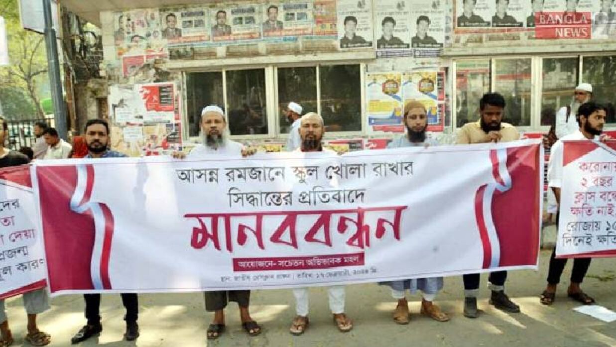 মানববন্ধনে বক্তারা বলেন, স্কুলের বার্ষিক ছুটির তালিকায় পরিবর্তন এনে ১০ বা ১৫ রোজা পর্যন্ত স্কুল খোলা রাখা একটি হঠকারী সিদ্ধান্ত। বছরের শুরুতে স্কুল ছুটির তালিকায় পুরো রমজান মাস ছুটির আওতায় রাখা হয়েছিল। কিন্তু কিছুদিন আগে হঠাৎ করে ছুটি বাতিল করে বলা হলো, রমজানে স্কুল খোলা থাকবে। সিয়াম সাধনার মাসে এ ধরনের সিদ্ধান্ত অভিভাবক এবং শিক্ষার্থীদের মারাত্মক হতাশ করেছে।