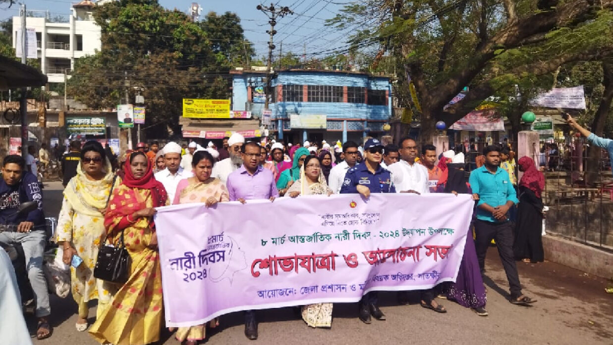 এর আগে ব্যানার ফেস্টুন ও বেলুন উড়িয়ে নারী দিবসের বর্ণাঢ্য শোভাযাত্রা ও দিবসটির উদ্বোধন করেন সংসদ সদস্য লায়লা পারভীন সেঁজুতি। শোভাযাত্রাটি শহরের শহীদ আব্দুর  রাজ্জাক পার্কে থেকে শুরু হয়ে শহরের প্রধান প্রধান সড়ক প্রদক্ষিণ করে জেলা শিল্পকলা একাডেমি মিলনায়তনে এসে নারী দিবসের আলোচনা সভায় মিলিত হয়