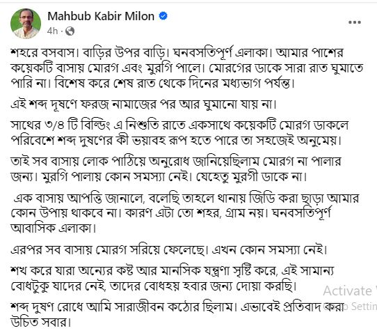 তবে বিষয়টি স্বীকার করেছেন তিনি। অতিরিক্ত সচিব মাহবুব কবির মিলন বলেছেন, মোরগের ডাকে সারা রাত ঘুমাতে পারি না। বিশেষ করে শেষ রাত থেকে দিনের মধ্যভাগ পর্যন্ত। তাই সব বাসায় লোক পাঠিয়ে অনুরোধ জানিয়েছিলাম মোরগ না পালার জন্য। এক বাসায় আপত্তি জানালে, বলেছি তাহলে থানায় জিডি করা ছাড়া আমার কোন উপায় থাকবে না।