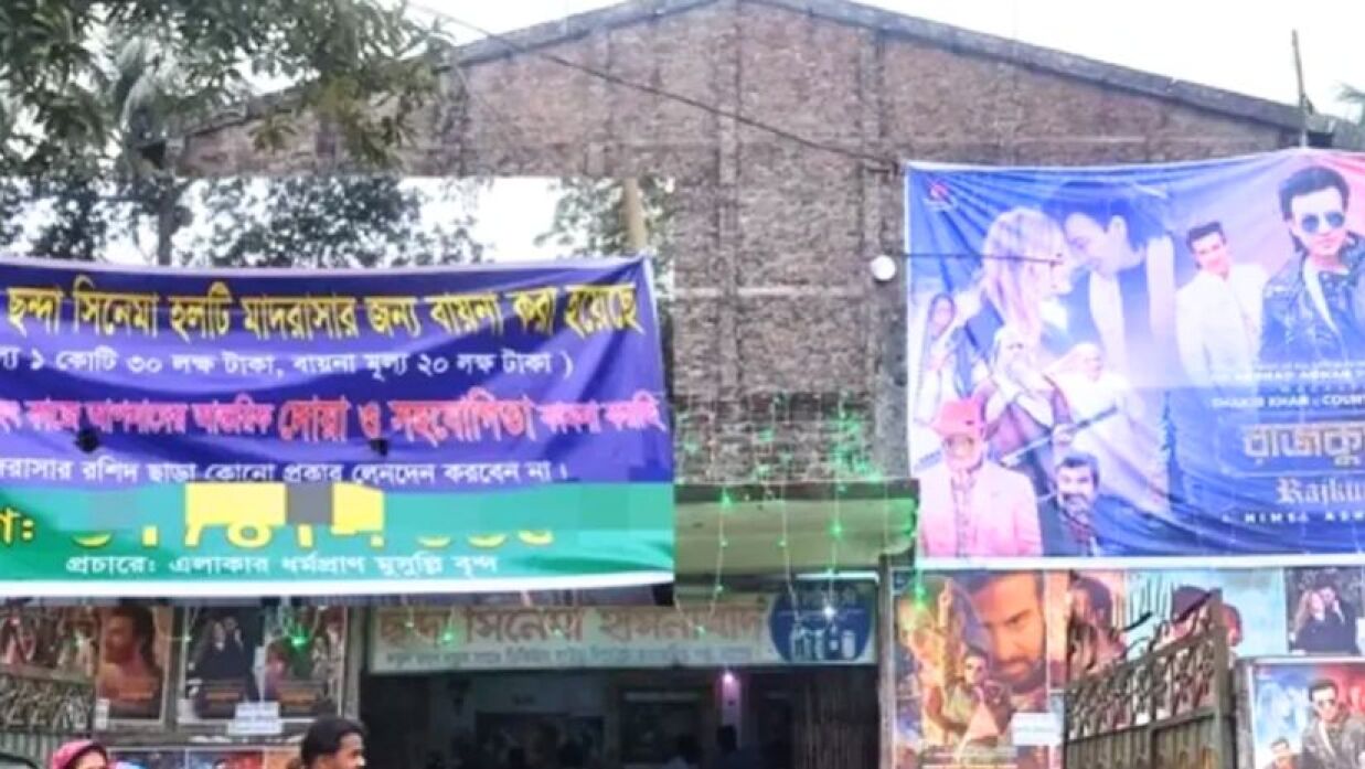 শনিবার (২০ এপ্রিল) দুপুরে হল এলাকায় দেখা যায়, রাস্তার পাশে একটি ব্যানার সাঁটানো হয়েছে। এতে লেখা রয়েছে, ‘আলহামদুলিল্লাহ ছন্দা সিনেমা হলটি মাদ্রাসার জন্য বায়না করা হয়েছে। চুক্তিমূল্য ১ কোটি ৩০ লাখ টাকা, বায়না মূল্য ২০ লাখ টাকা। সদকায়ে জারিয়ার এ মহৎ কাজে আপনাদের আন্তরিক দোয়া ও সহযোগিতা কামনা করছি। প্রচারে স্থানীয় ধর্মপ্রাণ মুসল্লিরা।’