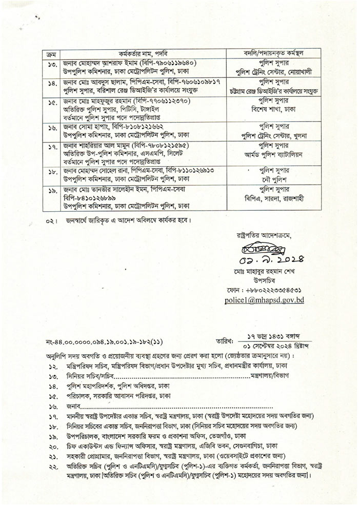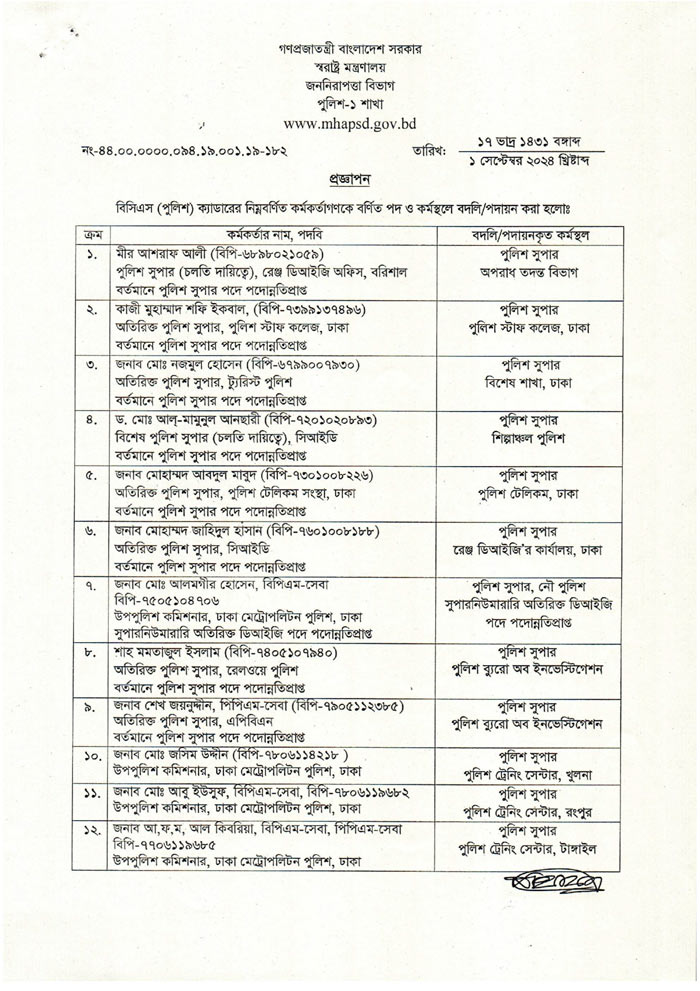 বদলির প্রজ্ঞাপনে বলা হয়, বিসিএস (পুলিশ) ক্যাডারের কর্মকর্তাদের বর্ণিত পদ ও কর্মস্থলে বদলি বা পদায়ন করা হলো।