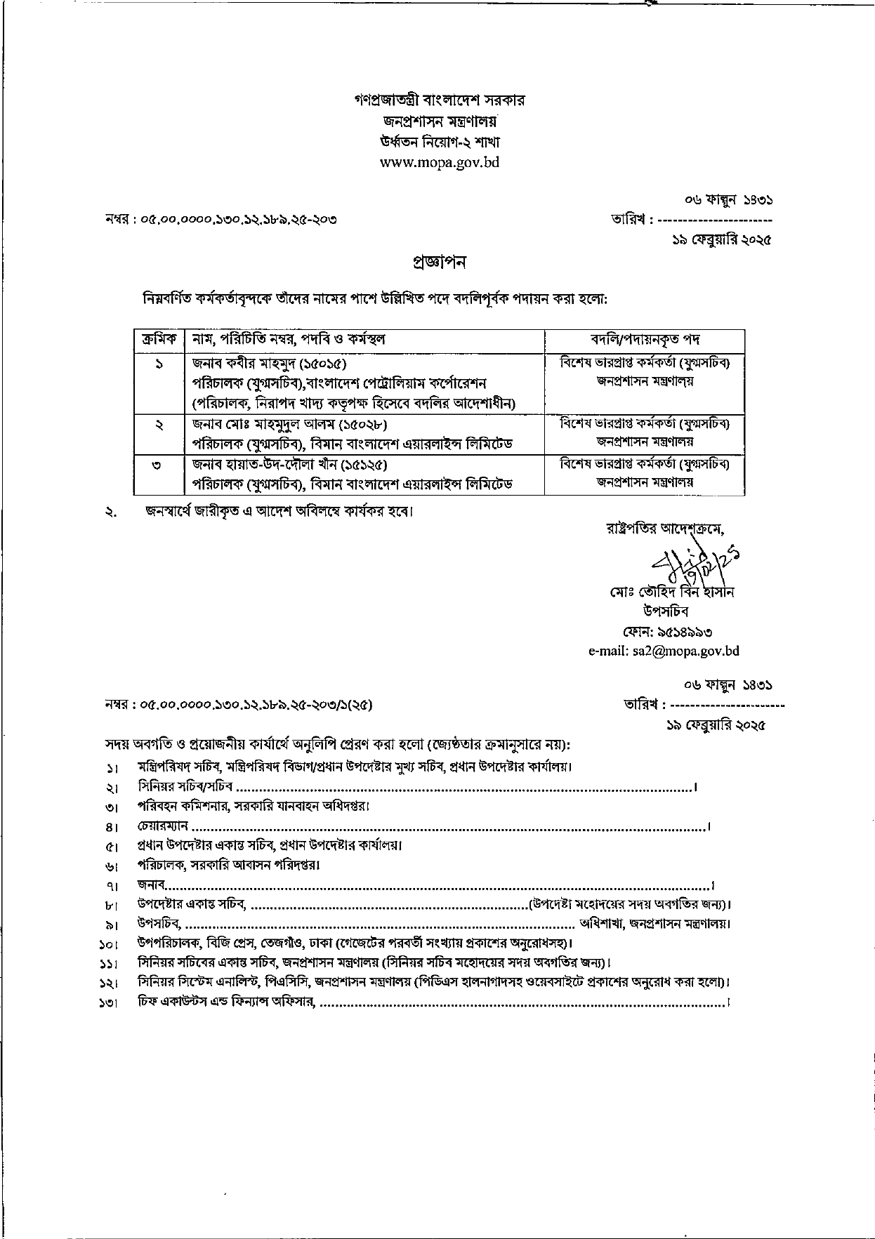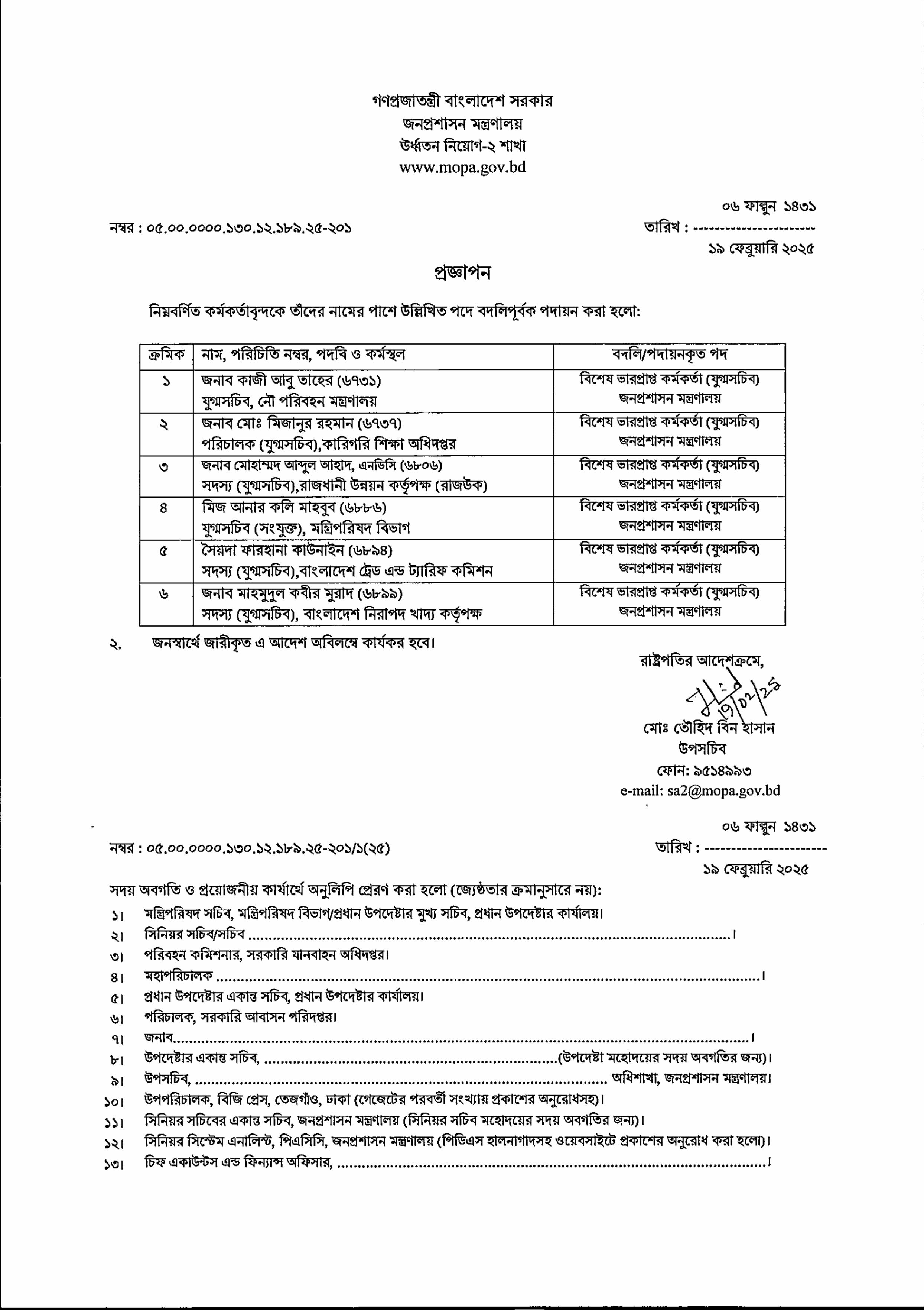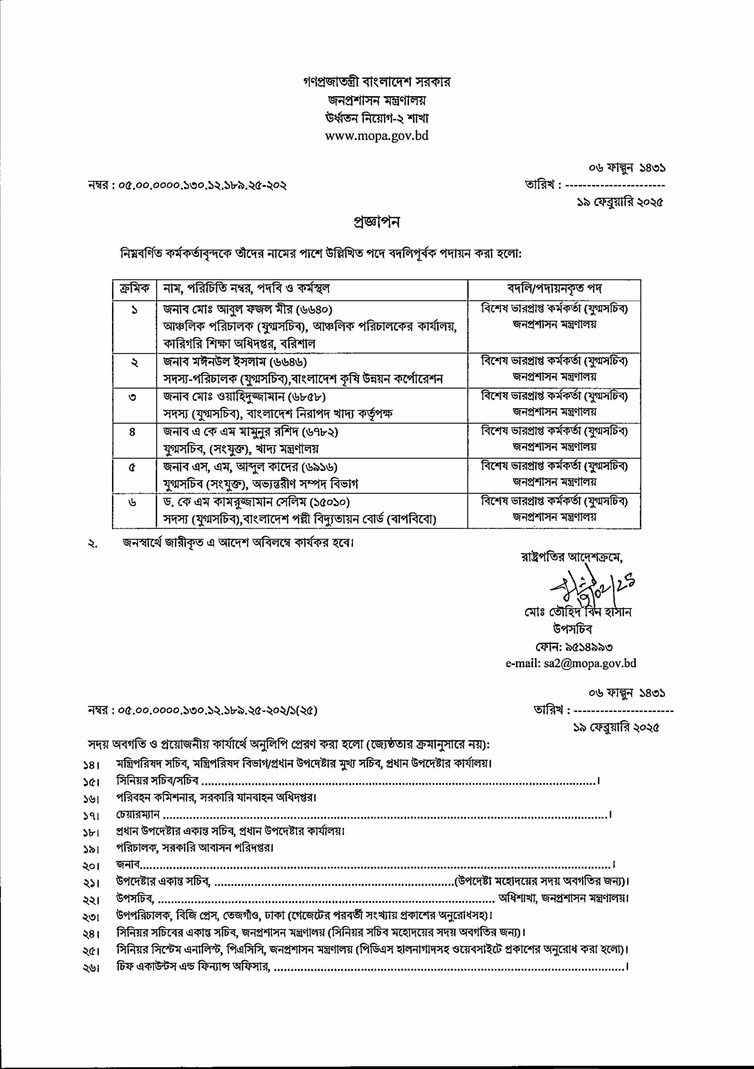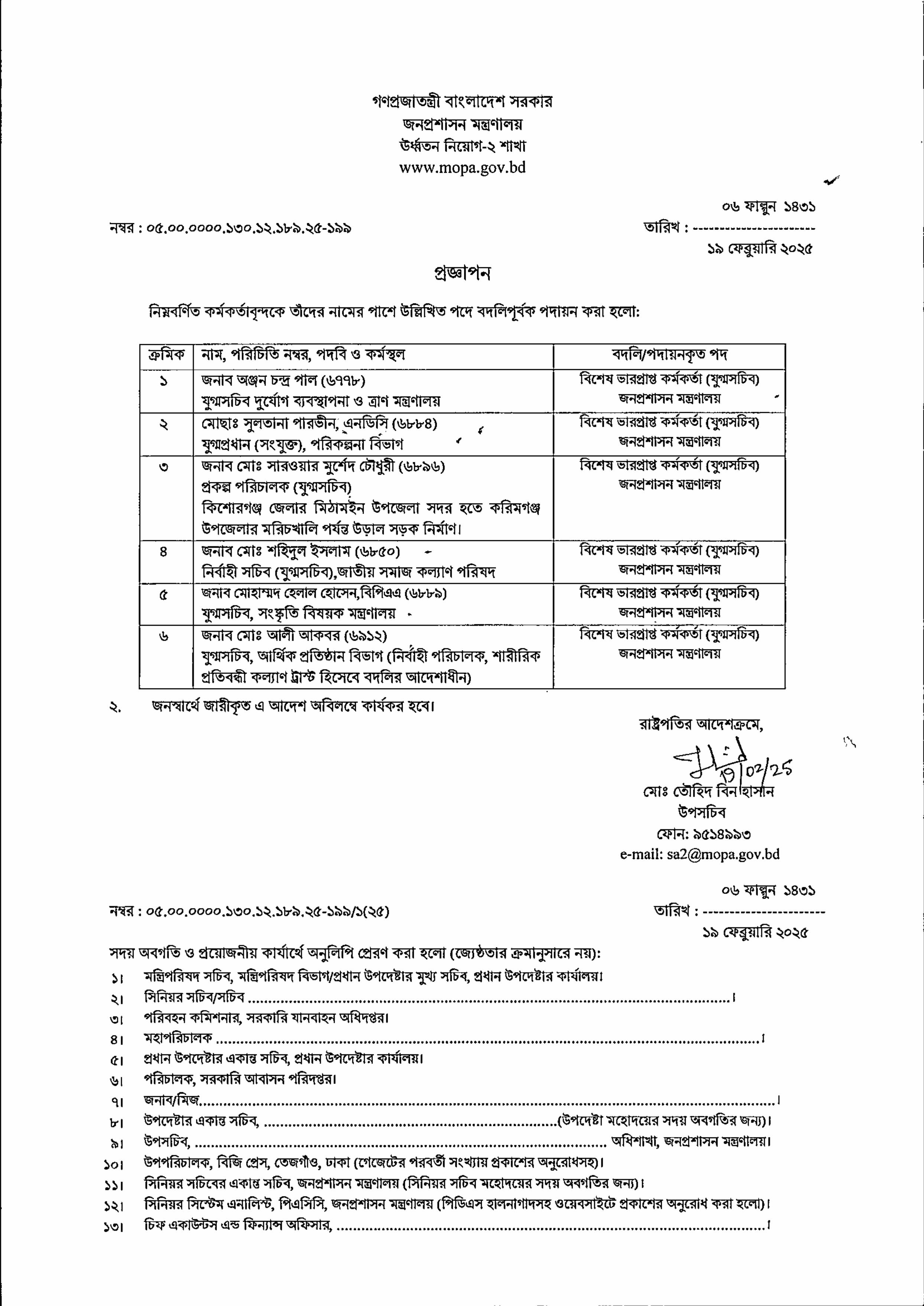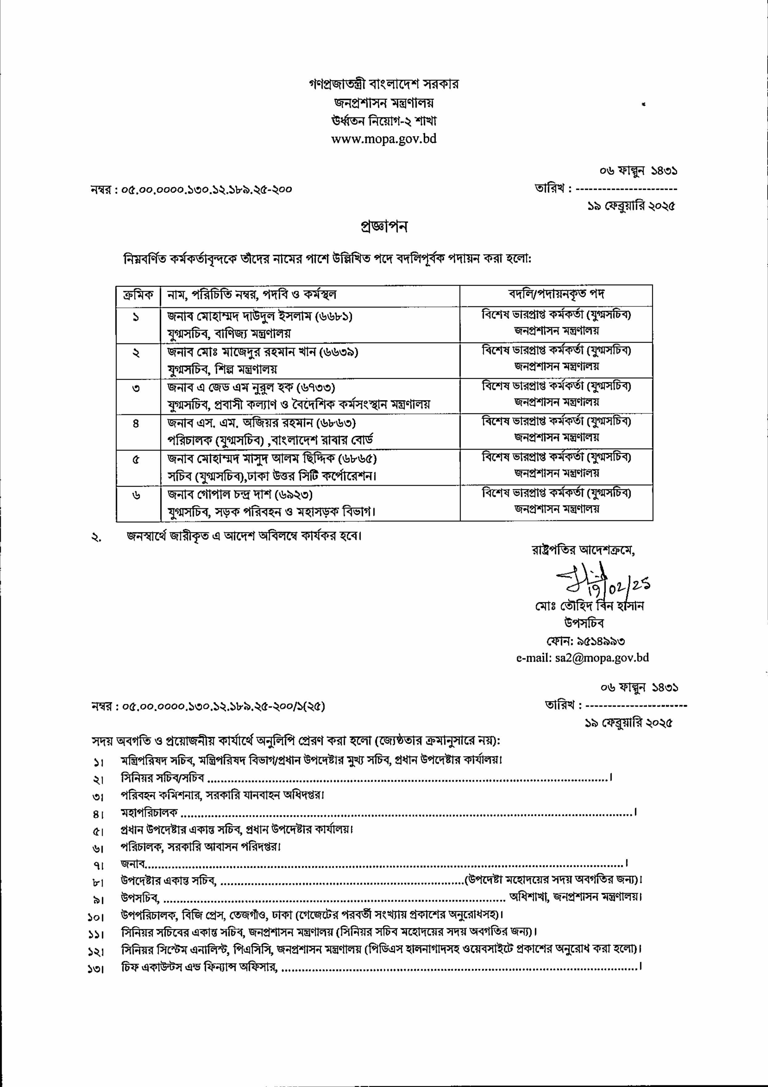আজ বুধবার (১৯ ফেব্রুয়ারি) জনপ্রশাসন মন্ত্রণালয়ের পৃথক ছয়টি প্রজ্ঞাপনে এই সিদ্ধান্তের কথা জানানো হয়। এর মধ্যে পাঁচটি প্রজ্ঞাপনে প্রতিটিতে ছয়জন করে এবং আরেকটিতে তিনজন কর্মকর্তাকে ওএসডি করার কথা জানানো হয়েছে।