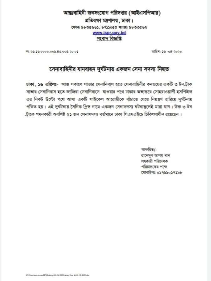আইএসপিআরের বিজ্ঞপ্তিতে জানানো হয়েছে, সাভার সেনানিবাস থেকে সেনাবাহিনীর কনভয়ের একটি ৩ টন ট্রাক জাজিরা যাওয়ার পথে ঢাকার অভ্যন্তরে সোহরাওয়ার্দী হাসপাতালের কাছে উল্টো পথে আসা একটি সাইকেল আরোহীকে বাঁচাতে গিয়ে নিয়ন্ত্রণ হারিয়ে দুর্ঘটনায় পড়ে। এই দুর্ঘটনায় সৈনিক প্রিন্স নামে একজন সেনাসদস্য ঘটনাস্থলেই মারা যান।