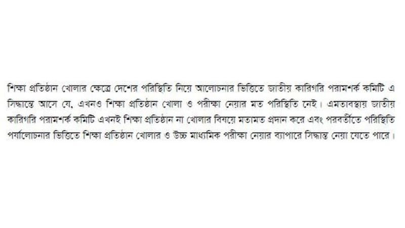 * এসব বিষয় বিবেচনা করে কমিটি তার পরামর্শ দেয় যে, এখন শিক্ষা প্রতিষ্ঠান খোলা ও পরীক্ষা নেয়ার মতো পরিস্থিতি নেই।