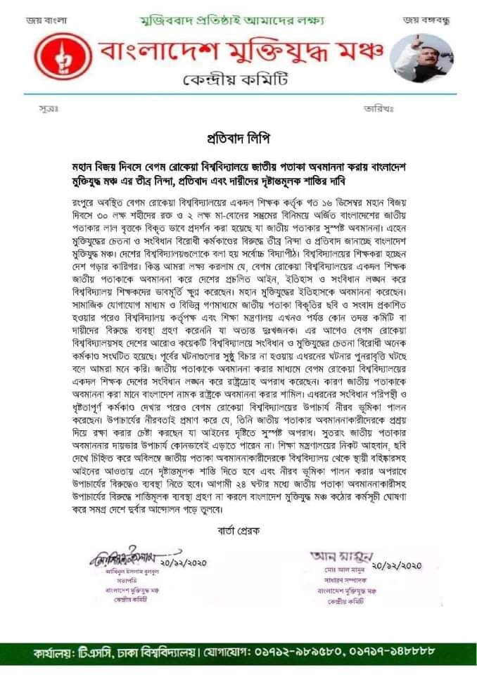 বিজ্ঞপ্তিতে বলা হয়, রংপুরে অবস্থিত বেগম রােকেয়া বিশ্ববিদ্যালয়ের একদল শিক্ষক কর্তৃক গত ১৬ ডিসেম্বর মহান বিজয় দিবসে ৩০ লক্ষ শহীদের রক্ত ও ২ লক্ষ মা-বােনের সম্ভ্রমের বিনিময়ে অর্জিত বাংলাদেশের জাতীয় পতাকার লাল বৃত্তকে বিকৃতভাবে প্রদর্শন করা হয়েছে যা জাতীয় পতাকার সুস্পষ্ট অবমাননা। মুক্তিযুদ্ধের চেতনা ও সংবিধান বিরোধী কর্মকাণ্ডের বিরুদ্ধে তীব্র নিন্দা ও প্রতিবাদ জানাচ্ছে বাংলাদেশ মুক্তিযুদ্ধ মঞ্চ।