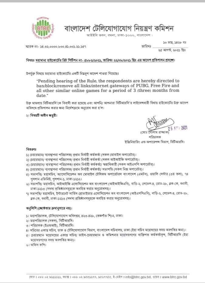 এ ছাড়া বিটিআরসির ভাইস চেয়ারম্যান সুব্রত রায় মৈত্র আজ বুধবার সংবাদমাধ্যমকে পাবজি ও ফ্রি ফায়ার বন্ধের তথ্য নিশ্চিত করেন। তিনি বলেন, আমরা উচ্চ আদালতের নির্দেশনা পেয়েছি। নির্দেশনার আলোকে ইতোমধ্যে পাবজি ও ফ্রি ফায়ার বন্ধ হয়ে গেছে। অন্য ক্ষতিকর অ্যাপগুলোও বন্ধ করার প্রক্রিয়া শুরু হয়েছে। বিগো লাইভ ও লাইকির মত আরো যেসব ইন্টারনেটভিত্তিক অ্যাপ রয়েছে আমরা এগুলোর তালিকা করছি। শিগগির এগুলো বন্ধের সিদ্ধান্ত আসবে।