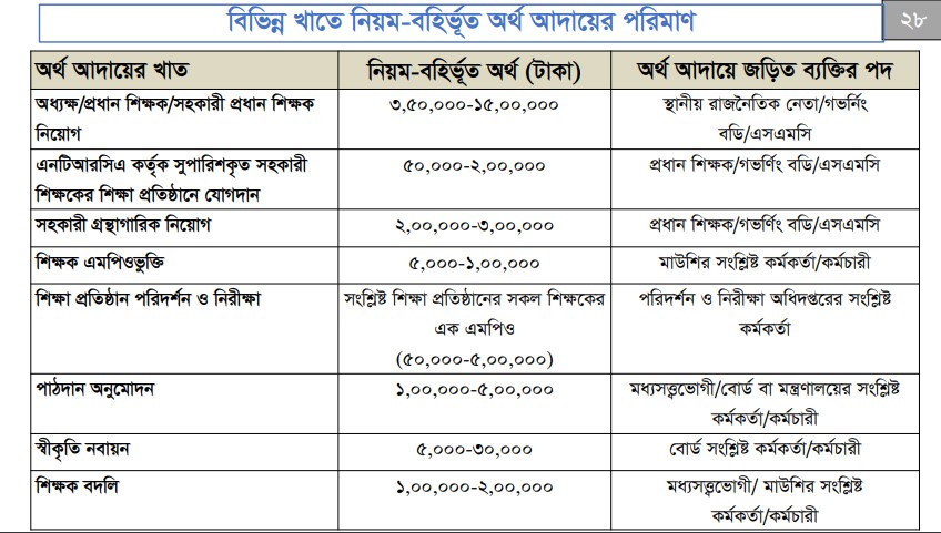 গবেষণায় আরও উঠে এসেছে, বেসরকারি শিক্ষক নিবন্ধন ও প্রত্যয়ন কর্তৃপক্ষ (এনটিআরসিএ) কর্তৃক সুপারিশকৃত সহকারী শিক্ষকের শিক্ষাপ্রতিষ্ঠানে যোগদানে ৫০ হাজার থেকে সর্বোচ্চ ২ লাখ টাকা পর্যন্ত লেনদেন হয়। সহকারী গ্রন্থাগারিক নিয়োগে ২ থেকে সর্বোচ্চ ৩ লাখ টাকা পর্যন্ত লেনদেন হয়।
