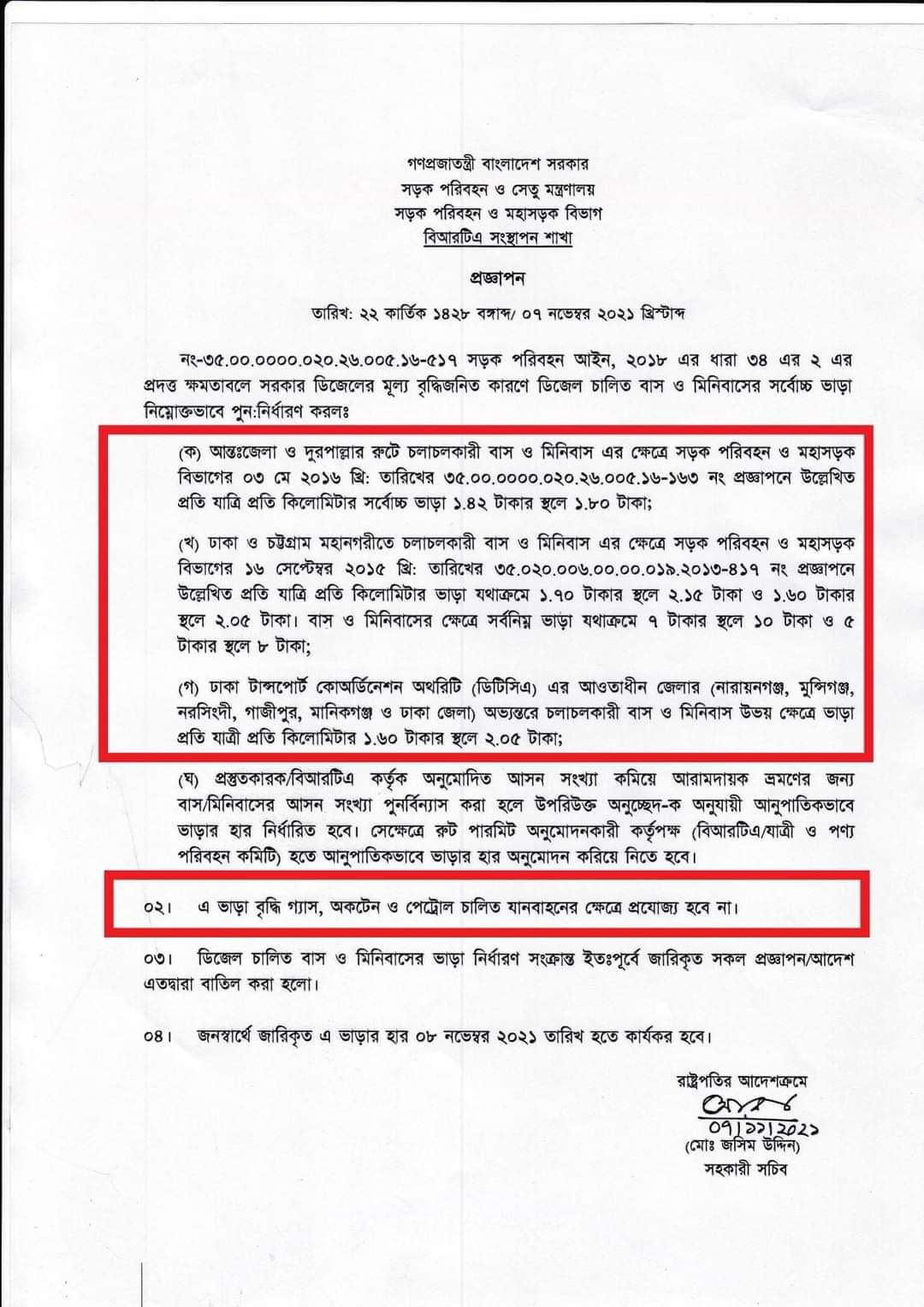 প্রজ্ঞাপনে বলা হয়, দূরপাল্লার প্রতি কিলোতে বাস ভাড়া ১ টাকা ৮০ পয়সা নির্ধারণ করা হয়েছে। আর মহানগরে চলাচলকারী বাসগুলোর ভাড়া প্রতি কিলোতে ২ টাকা ১৫ পয়সা নির্ধারণ করা হয়েছে। আগামীকাল সোমবার (৮ নভেম্বর) থেকে নতুন এই সিদ্ধান্ত কার্যকর হবে।