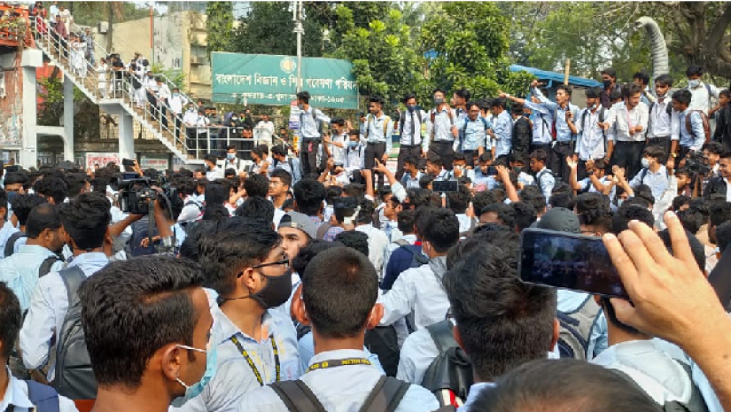 হাফ ভাড়া নিশ্চিতের দাবিতে সাইন্সল্যাবে সড়ক অবরোধ