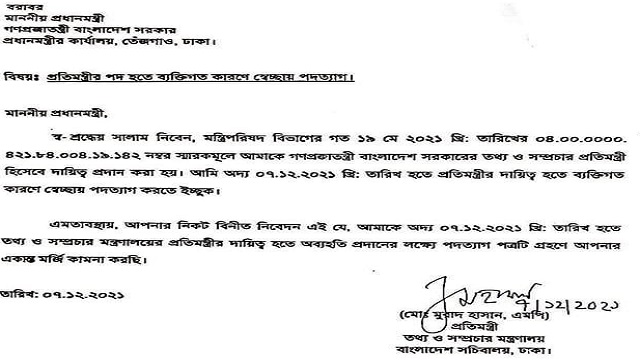 পদত্যাগ পত্রে তিনি লিখেছেন, মাননীয় প্রধানমন্ত্রী, স্বশ্রদ্ধেয় সালাম নিবেন। মন্ত্রিপরিষদ বিভাগের গত ১৯ মে ২০২১ খ্রি. তারিখের ০৪.০০.০০০০.৪২১.৮৪.০০৪.১৯.১৪২ নম্বর স্মারকমূলে আমাকে গণপ্রজাতন্ত্রী বাংলাদেশ সরকারের তথ্য ও সম্প্রচার প্রতিমন্ত্রী হিসেবে দায়িত্ব প্রদান করা হয়। আমি অদ্য ০৭.১২.২০২১ খ্রি. তারিখ হতে প্রতিমন্ত্রীর দায়িত্ব হতে ব্যক্তিগত কারণে স্বেচ্ছায় পদত্যাগ করতে ইচ্ছুক।