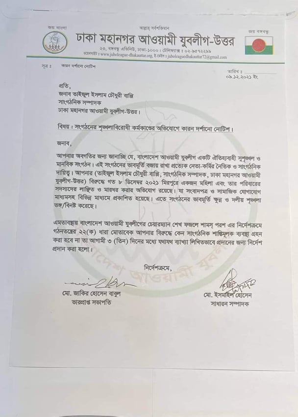 বৃহস্পতিবার (৯ ডিসেম্বর) রাতে যুবলীগের চেয়ারম্যান শেখ ফজলে শামস পরশ ও সাধারণ সম্পাদক মাইনুল হোসেন খান নিখিলের নির্দেশে ঢাকা মহানগর উত্তর যুবলীগের ভারপ্রাপ্ত সভাপতি জাকির হোসেন বাবুল ও সাধারণ সম্পাদক ইসমাইল হোসেন তাকে বহিষ্কার করেন।