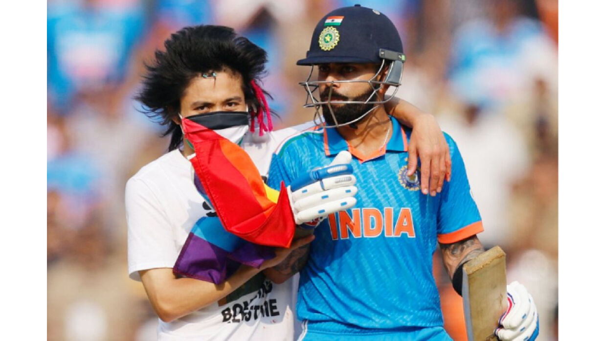 সেই সময় বল করছিলেন অ্যাডাম জাম্পা। ব্যাট করছিলেন বিরাট কোহলি। চতুর্থ বলের আগেই মাঠে ঢুকে পড়েন এক দর্শক। তিনি সটান চলে যান কোহলির কাছে। তাঁর সাদা জার্সিতে লেখা ছিল ‘স্টপ বম্বিং প্যালেস্তাইন’। অর্থাৎ প্যালেস্তাইনে বোমা ফেলা বন্ধ করো।