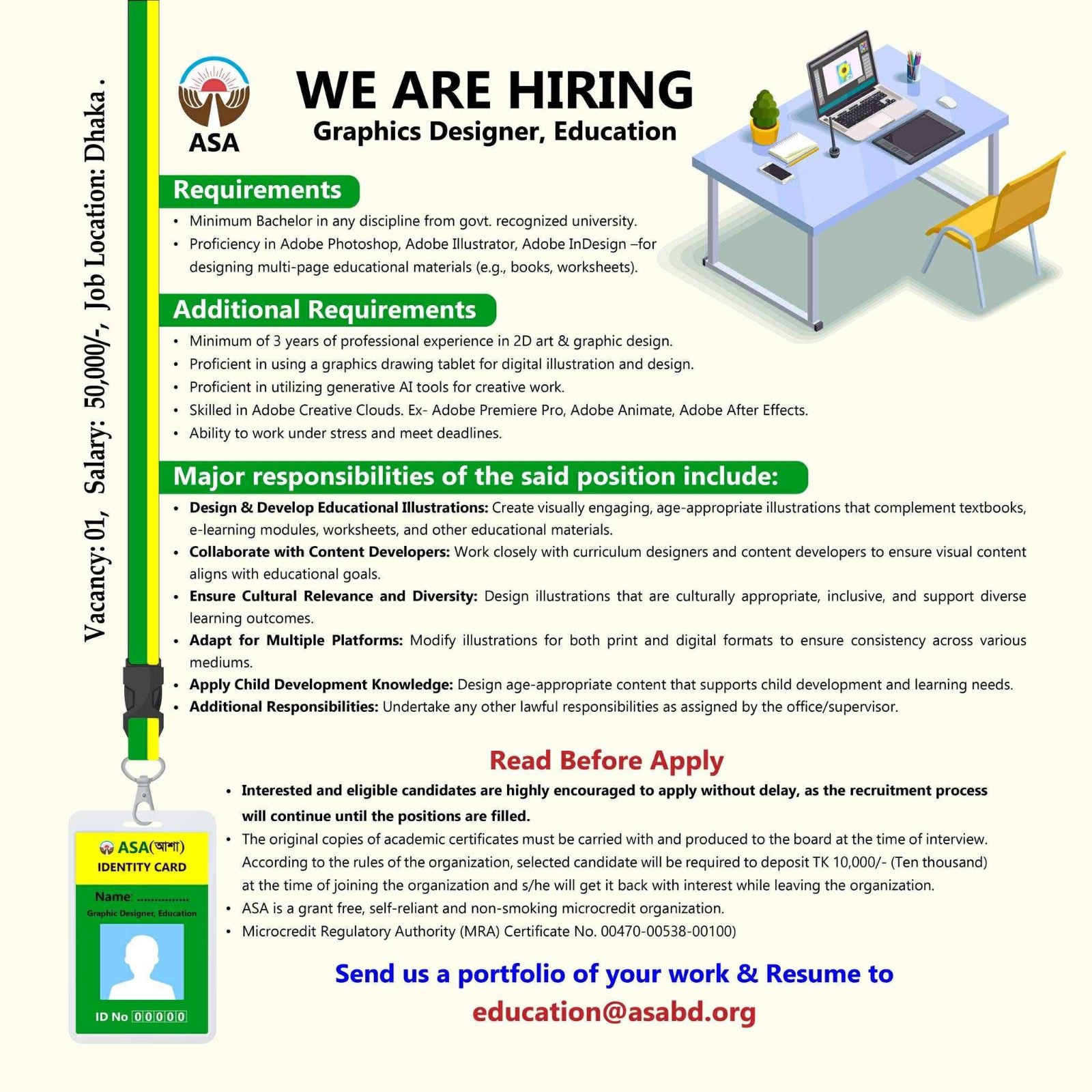 আগ্রহী প্রার্থীরা education@asabd.org ঠিকানায় ই-মেইলের মাধ্যমে সিভি ও পোর্টফোলিও পাঠিয়ে আবেদন করতে পারবেন;