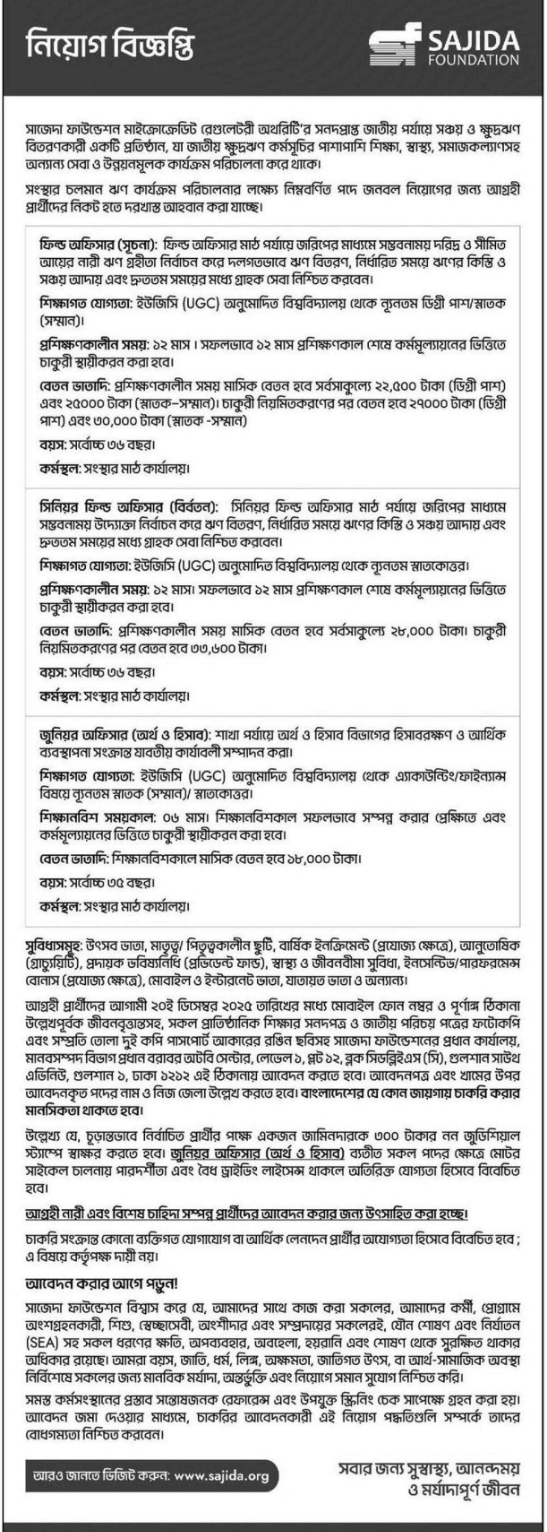 ফিল্ড অফিসার নিয়োগ দেবে সাজিদা ফাউন্ডেশন, আবেদন শেষ ২০ ডিসেম্বর