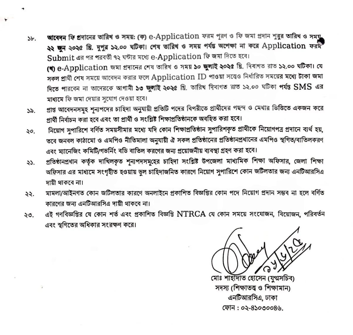 প্রতিষ্ঠান প্রধানের দাখিলকৃত শূন্যপদগুলোর চাহিদা সংশ্লিষ্ট উপজেলা মাধ্যমিক শিক্ষা অফিসার, জেলা শিক্ষা অফিসারের মাধ্যমে সংগৃহীত হওয়ায় ভুল চাহিদাজনিত কারণে নিয়োগ সুপারিশে কোনো জটিলতার জন্য এনটিআরসিএ দায়ী থাকবে না।