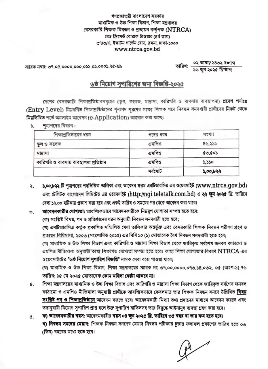 বেসরকারি শিক্ষাপ্রতিষ্ঠানে প্রবেশ পর্যায়ে এক লাখ ৮২২ জন শিক্ষক নিয়োগের ৬ষ্ঠ বিজ্ঞপ্তি প্রকাশ করা হয়েছে। আগামী ২২ জুন থেকে আবেদনগ্রহণ শুরু হবে। যা চলবে ১০ জুলাই রাত ১২টা পর্যন্ত। টাকা জমা দেওয়া যাবে ১৩ জুলাই পর্যন্ত।