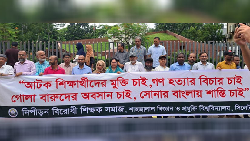 কিন্তু এই পরিস্থিতির ফলে আন্দোলন আরও গতি পায়। আমরা শিক্ষকেরাও ততদিনে ক্যাম্পাসের পাশাপাশি সিলেট শহরকেন্দ্রিক আন্দোলনে যোগ দিতে থাকি। আন্দোলনের ভাষাও ততদিনে বদলে গেছে। বক্তব্য-বিবৃতি আর ব্যানার-ফেস্টুনের শব্দের গাঁথুনি হতে থাকে বিদ্রোহের সুরে। সিলেট শহীদ মিনারে শাবিপ্রবির নিপীড়নবিরোধী শিক্ষক সমাজের সাদা ব্যানারে লাল কালিতে লেখা শব্দগুলো এখনো আউড়িয়ে ফিরি। সময়ের সাহসী সেই উচ্চারণ আজ স্মৃতির মানসপটে প্রায় উঁকি দেয়। ওই ব্যানারে লেখা হয়েছিল- “আটক শিক্ষার্থীদের মুক্তি চাই, গণহত্যার বিচার চাই। গোলা বারুদের অবসান চাই, সোনার বাংলায় শান্তি চাই।”