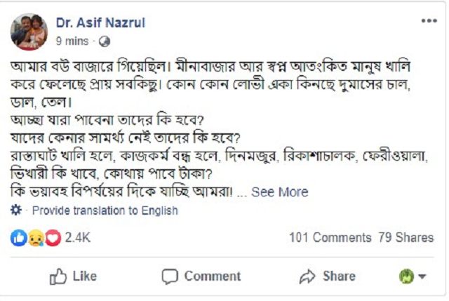 করোনাভাইরাসের কারণে শঙ্কিত হয়ে অনেকে বাড়তি পণ্য কিনে মজুদ করায় তীব্র ক্ষোভ প্রকাশ করেছেন ঢাকা বিশ্ববিদ্যালয়ের আইন বিভাগের অধ্যাপক আসিফ নজরুল। এতে সাধারণ নিম্ন আয়ের মানুষ ক্ষতিগ্রস্ত হবে বলেও আশঙ্কা প্রকাশ করেছেন তিনি।