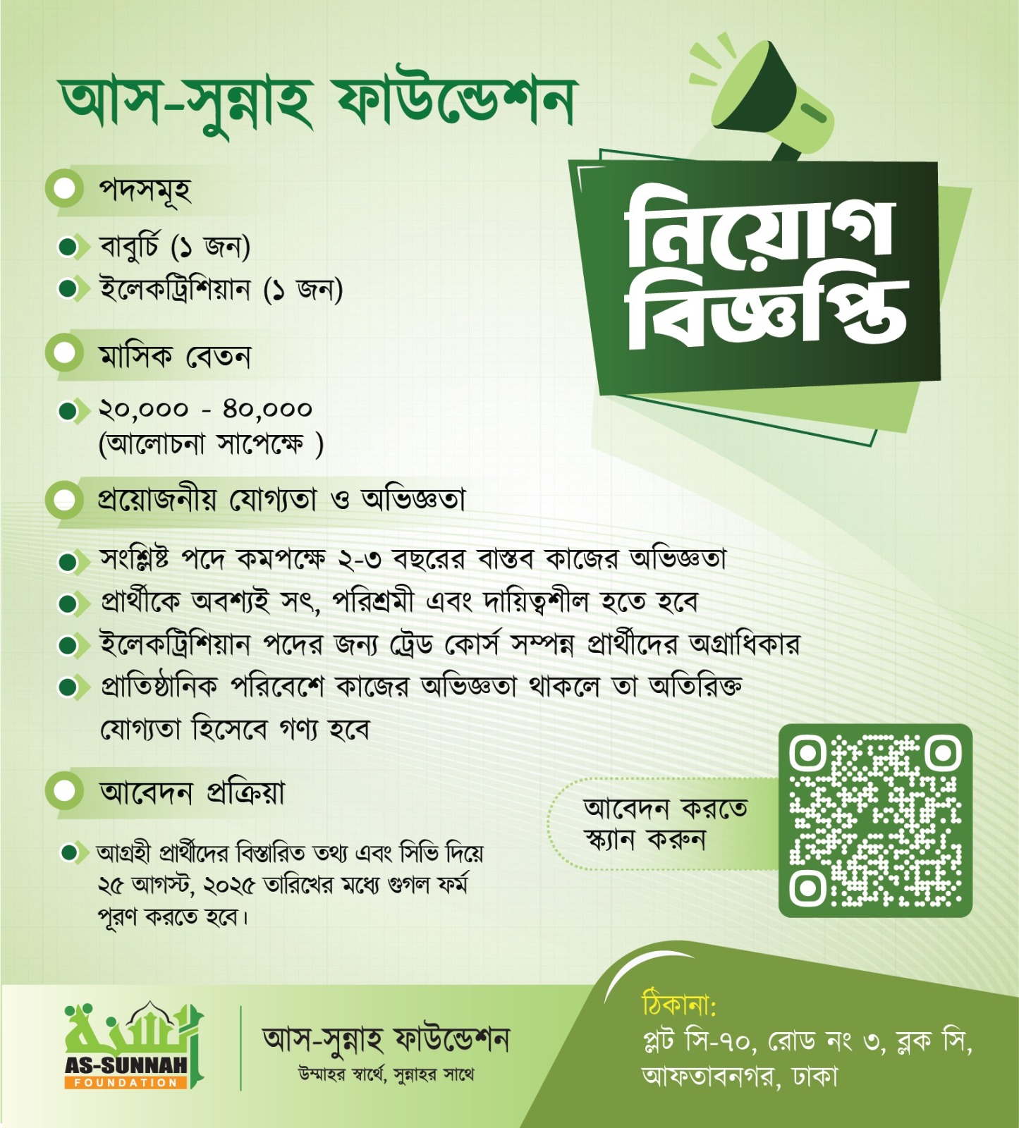 আস-সুন্নাহ ফাউন্ডেশনে চাকরি, প্রভিডেন্ট ফান্ডসহ দেবে নানা সুবিধা