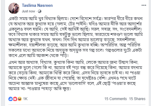 এখন আর অখ্যাত, বিখ্যাত, কুখ্যাত কিনা আমি, লোকে আমার জন্য উন্মাদ কিনা, আমাকে ভুলে গেলো কি না, আমার বই পড়া বন্ধ করে দিয়েছে কিনা, আমার বদনাম করে বেড়ায় কিনা, আমাকে খিস্তি করে কিনা, এসব নিয়ে ভাবতে চাই না। না পাওয়া নিয়ে ক্ষোভ নেই। এক জীবনে যা পেয়েছি, তা যথেষ্টরও বেশি। এখনও পথে ঘাটে অচেনা অজ্ঞাত মানুষেরা কাছে এসে 'ভালোবাসি' বলে, এই ছোট্ট 'পাওয়া'র কাছে আমার ‘না- পাওয়ার পাহাড়’ অতি ক্ষুদ্র।