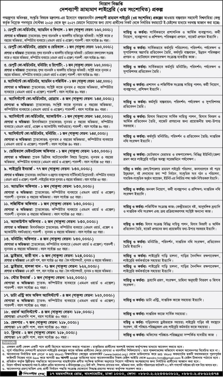 জনবল নিয়োগে বিজ্ঞপ্তি প্রকাশ করেছে সংস্কৃতিবিষয়ক মন্ত্রণালয়ের অধীনে গণগ্রন্থাগার অধিদপ্তরের উদ্যোগে বাস্তবায়নাধীন দেশব্যাপী ভ্রাম্যমাণ লাইব্রেরি (৩য় সংশোধিত) প্রকল্পের আওতায় বিশ্বসাহিত্য কেন্দ্র। প্রতিষ্ঠানটি ২০ পদে ১৯১ কর্মকর্তা-কর্মচারী নিয়োগে ১৯ আগস্ট প্রকাশ করেছে এ বিজ্ঞপ্তি। প্রকল্পের মেয়াদ সেপ্টেম্বর ২০২৫ থেকে জুন ২০২৭। আগ্রহী প্রার্থীরা নির্ধারিত ফরম্যাটে ই-মেইলের মাধ্যমে ৩০ আগস্টের মধ্যে আবেদন করতে পারবেন। একজন প্রার্থী একটি পদের জন্য আবেদন করতে পারবেন।