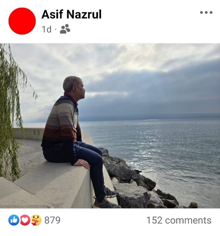 আসিফ নজরুল তার ব্যক্তিগত ফেসবুক অ্যাকাউন্টে দুইদিন আগে পোস্ট দিয়েছেন, ‘আমি এখন ইউরোপে। অনেকদিন পর ভালো করে ঘুমাবো। কাল থেকে আবার কাজ।’ তবে ইউরোপের কোন দেশে তিনি গেছেন, তা তিনি উল্লেখ করেননি। অবশ্য, একদিন পর তিনি ফেসবুকে তা পরিষ্কার করেন। রবিবার (৩ নভেম্বর) সকালে তিনি ফেসবুকে লিখেন, ‘সানডে মর্নিং, জেনেভা’। এ ক্যাপশনের সঙ্গে আছে লেকের পাড়ে সকালবেলা বিভিন্ন মানুষের ‘মর্নিং ওয়াক’-এর ভিডিও। একই দিন তিনি তার ব্যক্তিগত ফেসবুক অ্যাকাউন্টে নিজের একটি ছবি পোস্ট করেন। ছবিতে দেখা যায়, আসিফ নজরুল লেকের পাড়ে বসে আছেন।