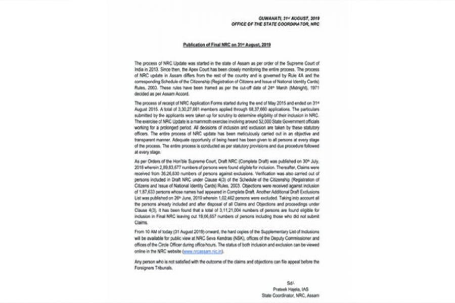 আসামের এনআরসি তালিকা প্রকাশ, বাদ পড়লেন ১৯ লাখ বাংলাভাষী হিন্দু-মুসলমান