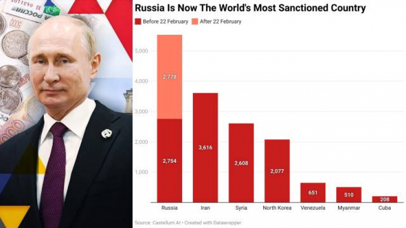 ক্যাস্টেলাম ডট এআইয়ের প্রতিবেদন অনুসারে, ২২ ফেব্রুয়ারির আগে রাশিয়ার বিরুদ্ধে ২ হাজার ৭৫৪টি নিষেধাজ্ঞা ছিল। তবে ইউক্রেনে হামলার পরে আরও ২ হাজার ৭৭৮টি নিষেধাজ্ঞা আরোপ করা হয়েছিল। ফলে এখন মোট নিষেধাজ্ঞার সংখ্যা ৫ হাজার ৫৩২টি।