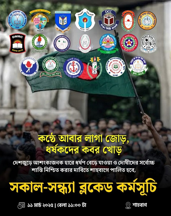 শিক্ষার্থীরা জানিয়েছেন, ‘কন্ঠে আবার লাগা জোর, ধর্ষকদের কবর খোড়’ স্লোগানে ব্লকেড কর্মসূচি পালন করবেন। দেশজুড়ে আশংকাজনক হারে ধর্ষণ বেড়ে যাওয়া ও দোষীদের সর্বোচ্চ শাস্তি নিশ্চিত করার দাবিতে শাহবাগে পালিত হবে সকাল-সন্ধ্যা ব্লকেড কর্মসূচি।