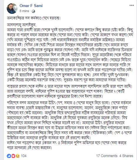 ব্যস্ততার প্রবাস থেকে নাঈম ও তার মায়ের সাথে আলাপকালে বলেছিলাম আমি তার পাশে আছি। আজ আবারো বলছি, নাঈমের পুলিশ হওয়ার স্বপ্ন বাস্তবায়নে পাশে থাকব। বিশ্বের ২ কোটি প্রবাসীদের ভালোবাসা সরূপ নাঈমকে পুরস্কারের টাকা দেব ইনশা আল্লাহ।