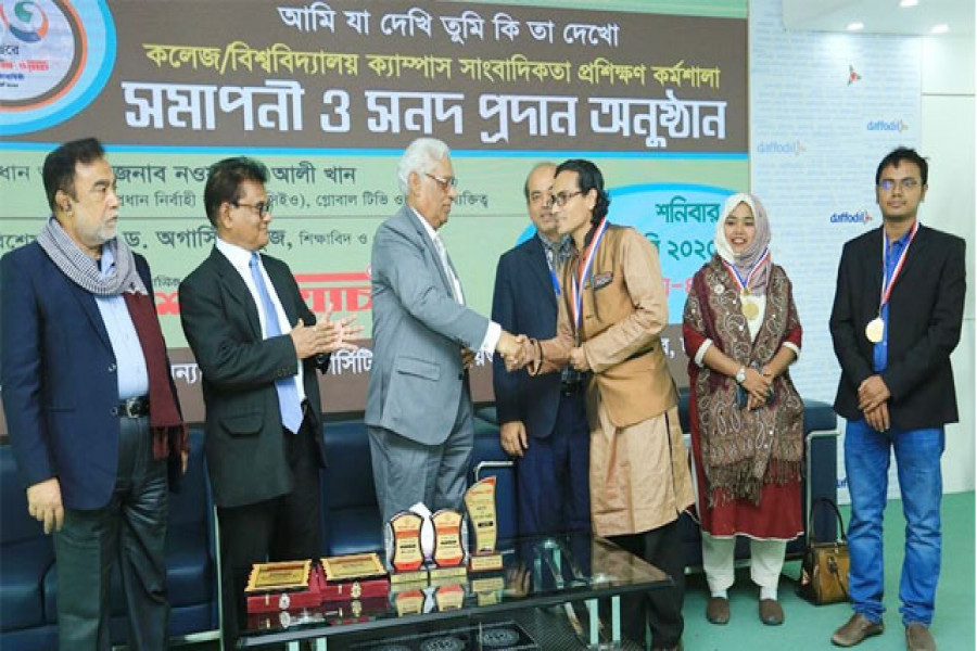 সাংবাদিকতা-প্রশিক্ষণ ও সংগঠনে বিশেষ অবদানের জন্য এডুকেশন ওয়াচ প্রশিক্ষক সম্মননা পেয়েছেন সাংবাদিক দম্পতি শান্তা ফারজানা ও মোমিন মেহেদী। ড্যাফোডিল ইন্টারন্যাশনাল ইউনিভার্সিটির ৭১ অডিটরিয়ামে অনুষ্ঠিত এক আড়ম্বরপূর্ণ আয়োজনে বরেণ্য গণমাধ্যম ব্যক্তিত্ব নওয়াজিশ আলী খান এ দম্পতিকে সম্মননা প্রদান করেন। এসময় এডুকেশন ওয়াচ সম্পাদক খলিলুর রহমান, শিক্ষাবিদ অগাস্টিন ক্রুজ, ড্যাফোডিল ইন্টারন্যাশনাল ইউনিভার্সিটির পরিচালক আনোয়ার হাসান কাজল ও ভূঁইয়া একাডেমির রেজিষ্ট্রার আবু তসলিম। এর আগে ভূঁইয়া একাডেমিতে সাবেক মন্ত্রী ব্যারিস্টার রাবিয়া ভূঁইয়ার আন্তরিকতার মধ্য দিয়ে অনুষ্ঠিত হয় দিনব্যাপী ক্যাম্পাসে সাংবাদিকতা বিষয়ক কর্মশালা। ‘আমি যা দেখি, তুমি কি তা দেখো’ শীর্ষক কর্মশালায় ঢাকা কলেজ সাংবাদিক সমিতির সাধারণ সম্পাদক বিল্লাল হোসেন সাগর সহ নবীন সংবাদকর্মীরা বক্তব্য রাখেন।