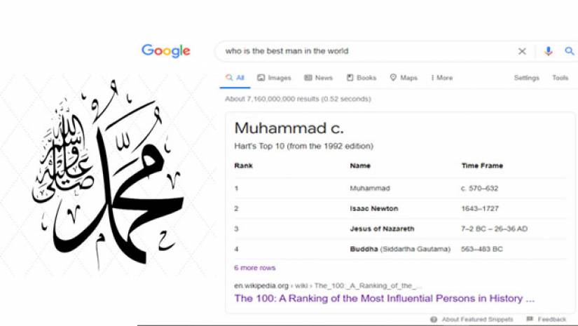 গুগলের এ তথ্য এখন সামাজিক যোগাযোগ মাধ্যমে এভাবে ভাইরাল যে- Best Man In The World ’Prophet Muhammad’. অর্থাৎ নবী মুহাম্মদ (সা.) বিশ্বের সেরা মহামানব।