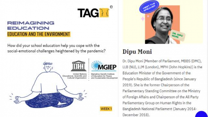বৈশ্বিক শিক্ষায় নেতৃত্বদানকারী তিনজন নেতার অন্যতম হিসাবে ইউনেস্কো মহাত্মা গান্ধী ইন্সটিটিউট অব এডুকেশন ফর পিস এন্ড সাসটেইনেবল ডেভেলপমেন্ট এর এক অনলাইন লাইভ সংলাপে অংশগ্রহণ করবেন শিক্ষামন্ত্রী ডা. দীপু মনি। কোভিড-১৯ পরবর্তী শিক্ষাব্যবস্থা পুননির্মাণ নিয়ে আগামী ১০ মে এই সংলাপ অনুষ্ঠিত হবে বলে জানা গেছে।