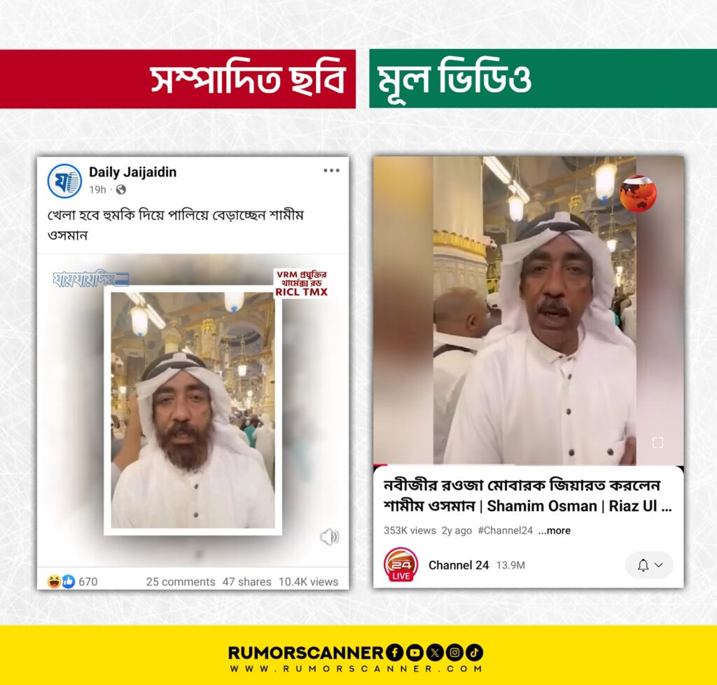 সুতরাং ২০২২ মদিনায় শামীম ওসমানের একটি ভিডিও থেকে তার ছবি নিয়ে তাতে দাড়ি-গোঁফ যুক্ত করে সাম্প্রতিক দাবিতে সামাজিক মাধ্যমে প্রচার করা হচ্ছে; যা সম্পাদিত।