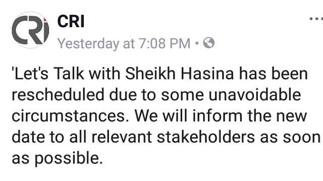 সিআরআই জানায়, অনিবার্য কারণে অনুষ্ঠানটির তারিখ পুননির্ধারণ করা হয়েছে। যত দ্রুত সম্ভব সংশ্লিষ্টদের নতুন তারিখ জানিয়ে দেয়া হবে।