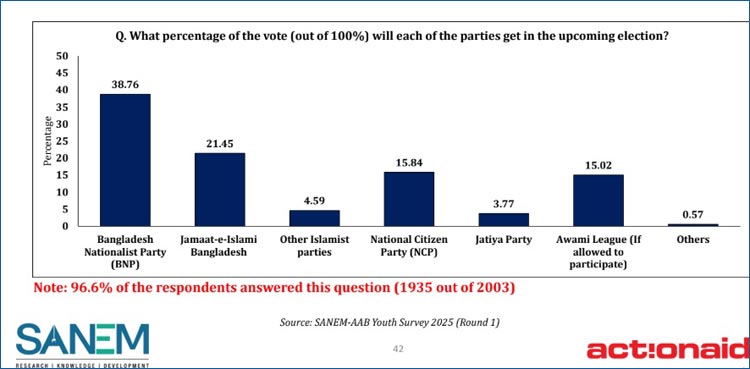জরিপ অনুযায়ী, তরুণরা মনে করেন, বিএনপি ৩৮ দশমিক ৭৬ শতাংশ ভোট পাবে। দ্বিতীয় অবস্থানে থাকবে জামায়াত, যারা পাবে ২১ দশমিক ৪৫ শতাংশ ভোট। অন্যান্য ধর্মীয় দলগুলো ৪ দশমিক ৫৯ শতাংশ ভোট পেতে পারে বলে মনে করেন তারা। এছাড়া জাতীয় নাগরিক পার্টি (এনসিপি) ১৫ দশমিক ৮৪ শতাংশ, জাতীয় পার্টি ৩ দশমিক ৭৭ শতাংশ এবং অন্যান্য দল শূন্য দশমিক ৫৭ শতাংশ ভোট পেতে পারে। আর গত ৫ আগস্ট ক্ষমতাচ্যুত আওয়ামী লীগ আসন্ন নির্বাচনে অংশ নিতে পারলে ১৫ শতাংশের কিছু বেশি ভোট পেতে পারে।