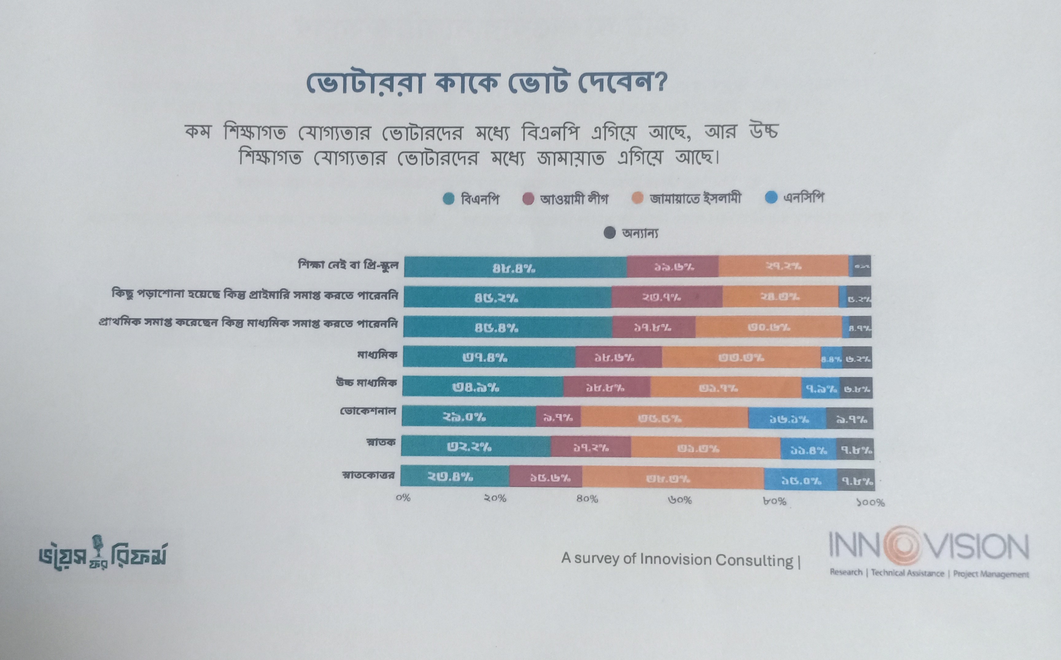 বেসরকারি সংস্থা ইনোভিশন কনসালটিংয়ের ‘পিপলস ইলেকশন পালস সার্ভে, দ্বিতীয় পর্ব - দ্বিতীয় খণ্ড’-এর প্রকাশিত প্রতিবেদনের তথ্য অনুযায়ী কম শিক্ষাগত যোগ্যতার ভোটারদের মধ্যে বেশি পছন্দে এগিয়ে রয়েছে বিএনপি এবং উচ্চ শিক্ষাগত যোগ্যতার ভোটারদের মধ্যে এগিয়ে রয়েছে জামায়াত। স্নাতকোত্তর পর্যায়ের নমুনা ভোটারদের পছন্দের তালিকায় শীর্ষে রয়েছে জামায়াত। এ তালিকায় দ্বিতীয় অবস্থানের রয়েছে বিএনপি।