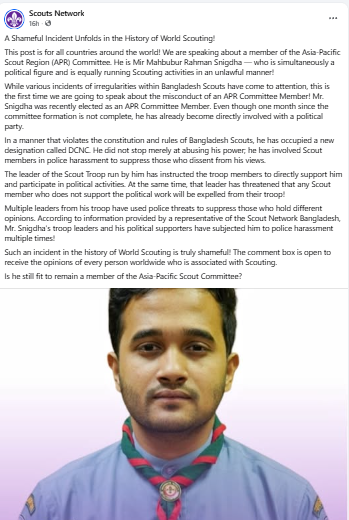 স্কাউট নেটওয়ার্ক ফেসবুক পেজের এক পোস্টে অভিযোগ করা হয়েছে, এশিয়া-প্যাসিফিক রিজিওন (এপিআর) স্কাউট কমিটির সদ্য নির্বাচিত সদস্য মীর মাহবুবুর রহমান স্নিগ্ধ একই সময়ে রাজনৈতিক কর্মকাণ্ডে সক্রিয় থেকে স্কাউট কার্যক্রমও পরিচালনা করছেন। এটি সম্পূর্ণ বেআইনি। কমিটি গঠনের এক মাসও না পেরোতেই তিনি সরাসরি একটি রাজনৈতিক দলে যোগদান করেছেন বলে ওই অভিযোগে বলা হয়েছে।