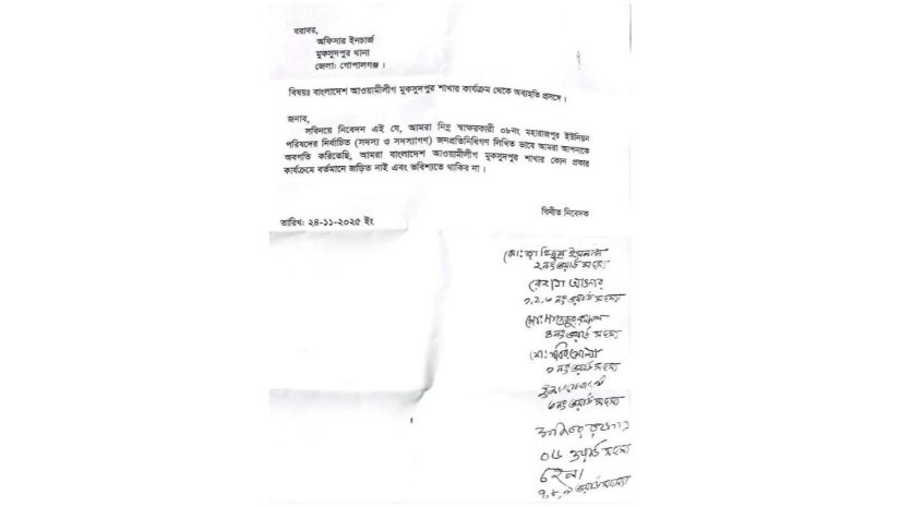 গোপালগঞ্জের মুকসুদপুর উপজেলায় থানার ওসির কাছে আবেদন করে কার্যক্রম নিষিদ্ধ আওয়ামী লীগের রাজনীতি ছাড়লেন উপজেলার মহারাজপুর ইউনিয়ন পরিষদের ৭ সদস্য। বিষয়টি সামাজিক যোগাযোগমাধ্যমে ছড়িয়ে পরার পর এলাকায় তোলপাড় সৃষ্টি হয়েছে। সোমবার (২৪ নভেম্বর) মুকসুদপুর থানার অফিসার ইনচার্জের (ওসি) মোস্তফা কামাল বরাবর এ আবেদন করেন।