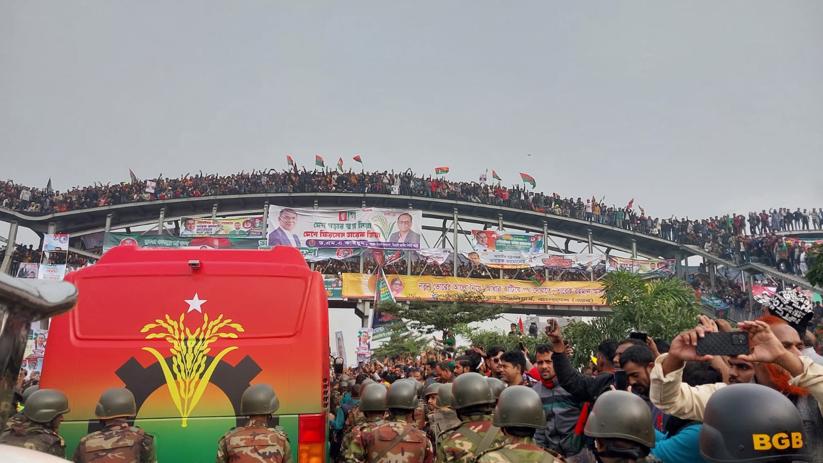 তারেক রহমানকে স্বাগত জানাচ্ছেন নেতাকর্মীরা