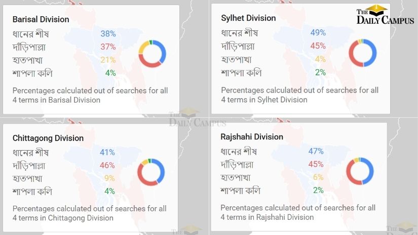 গুগলে ঢাকা বিভাগের (বর্তমান ঢাকা–ময়মনসিংহ) আওতাভুক্ত আগের জেলাগুলো ধরে সাত বিভাগের তথ্য দেওয়া রয়েছে। সে হিসেবে চট্টগ্রাম, রংপুর, খুলনা বিভাগে দাঁড়িপাল্লা এগিয়ে রয়েছে। অন্যন্য বিভাগে এগিয়ে আছে ধানের শীষ। রংপুর বিভাগে তুলনামূলকভাবে শাপলা কলির অবস্থান ভালো। এছাড়া বরিশাল বিভাগে হাতপাখার।