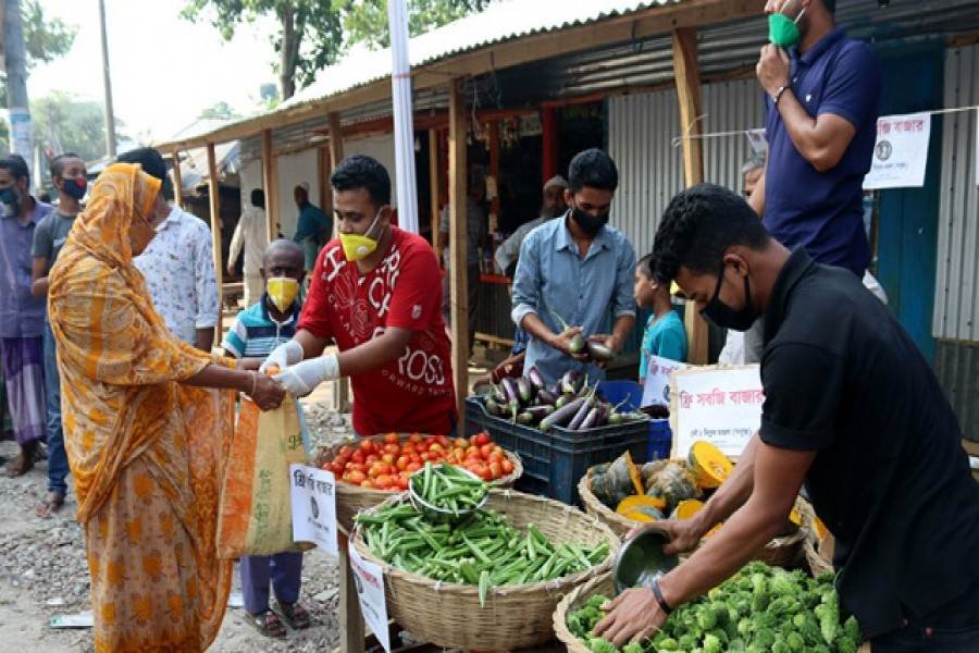 প্রায় ২শতাধিক কর্মহীন শ্রমজীবী মানুষ সামাজিক দূরত্ব বজায় রেখে ১ কেজি টমেটো, ১ কেজি বেগুন, ১ কেজি ঢেঁরস, ১ কেজি কোরলা ও ১ কেজি করে কুমড়ো নিয়ে নেন।